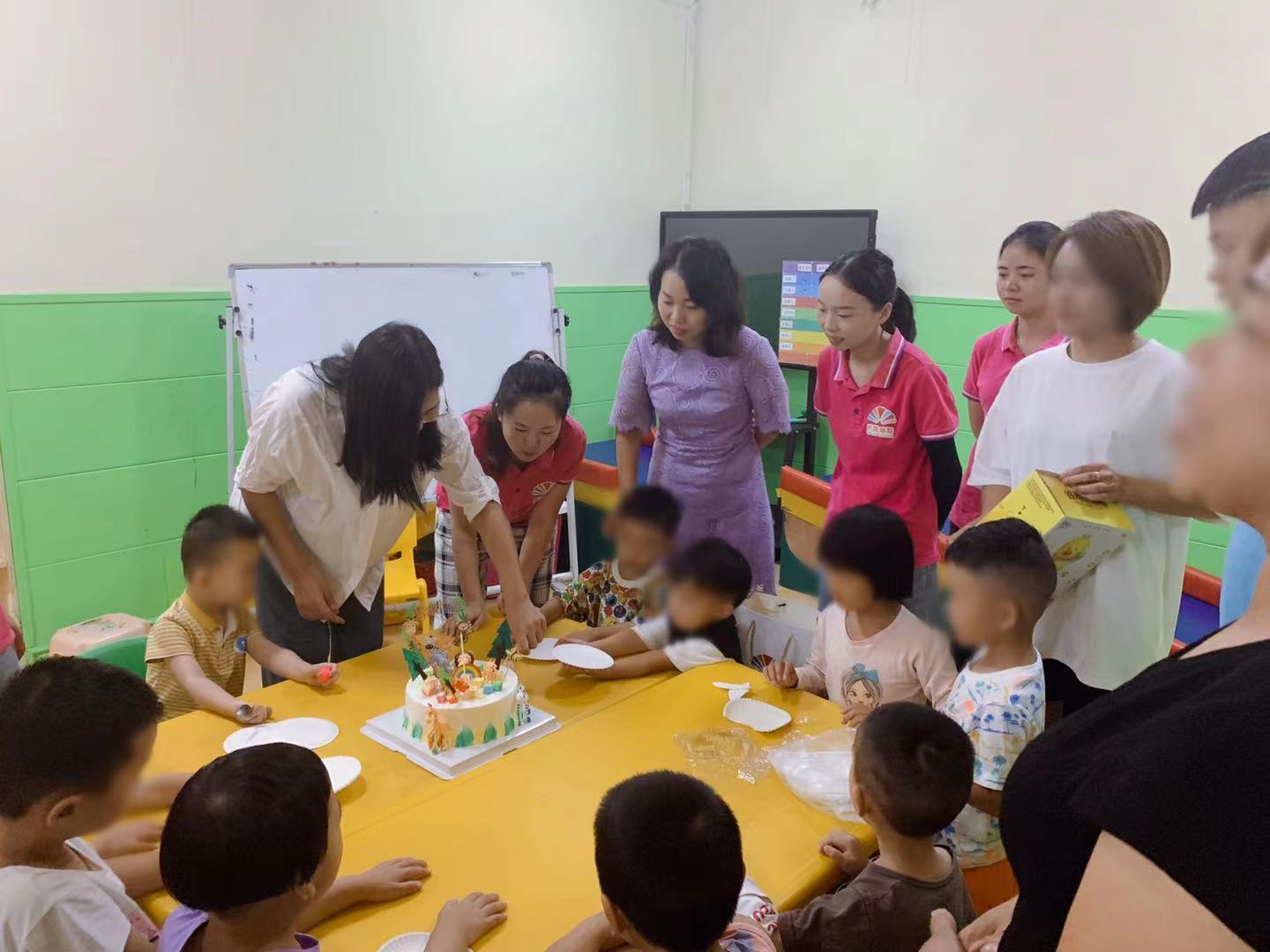 中心还贴心地为小朋友们准备了庆祝蛋糕和小礼物,小朋友们看到吃的手舞足蹈,激动万分,但在老师的引导下,他们忍住美食的诱惑,抱臂坐端,耐心地等着老师分发蛋糕,这温馨的画面让在场的老师和家长们都感动不已。