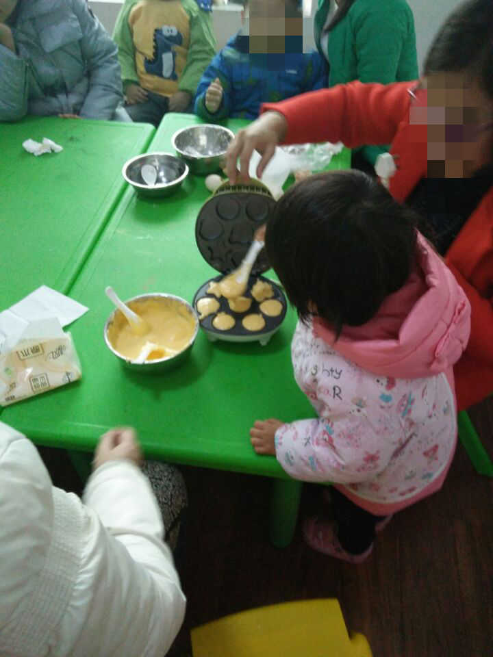 接下来江老师带着孩子和家长们来到小组课教室,一起来完成这一天的第一个环节———做蛋糕..............