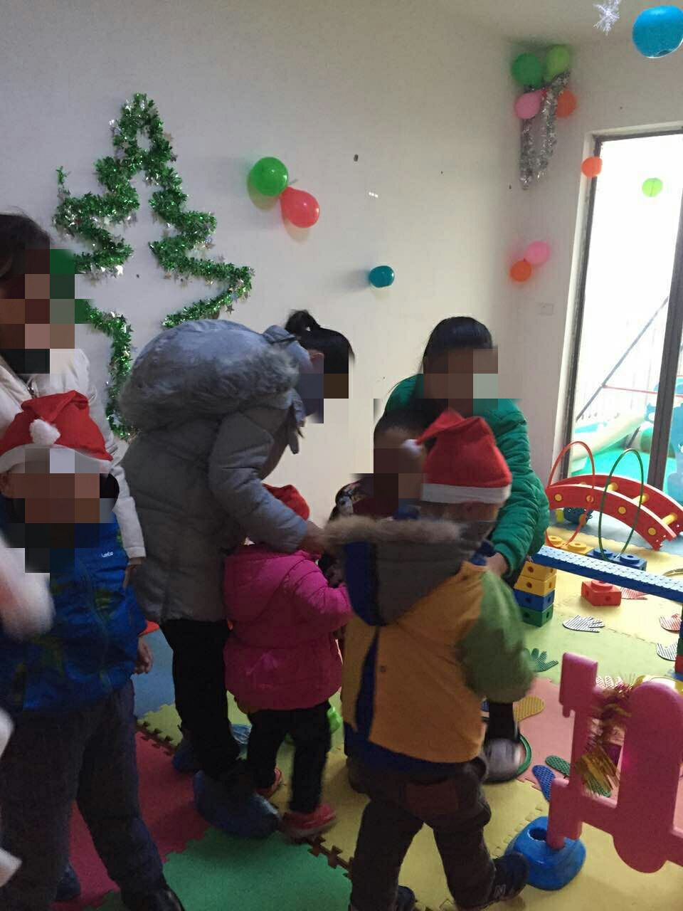 这一天的早上,孩子和家长们来到了老师们精心布置的教室,里面有孩子们喜欢的各种颜色的气球、彩带、圣诞树、圣诞老人的贴画.............